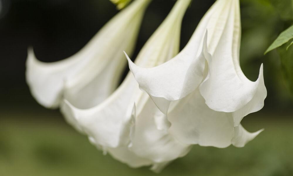 Brugmansia alebo inak anjelské trúbky bývajú ozdobou každej záhrady. Tieto veľké kvety majú okrem iných farebných odtieňov aj žiarivú bielu farbu. Zvyčajne kvitne od polovice leta do jesene. V chladnom podnebí sa táto tropická rastlina musí pestovať v nádobách a na zimu preniesť do interiéru.