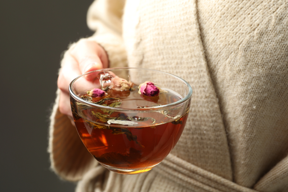 Žena si vychutnáva bylinkový čaj s ružovými púčikmi na zmiernenie menopauzálnych príznakov. Zdroj foto: Depositphotos