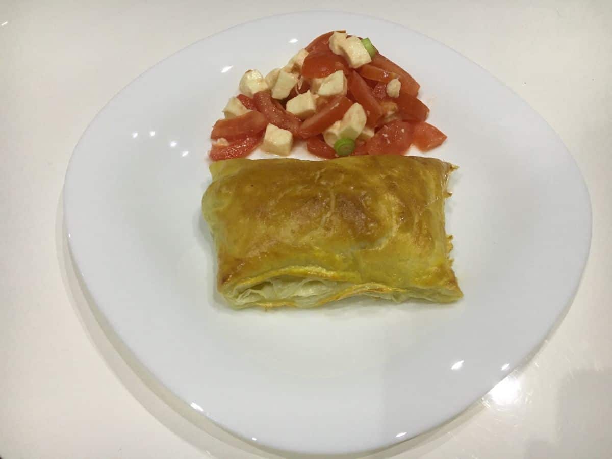 Kuracie prsia umyjeme a nakrájame na drobné kúsky, osolíme a okoreníme. Na troche olivového oleja orestujeme kúsky mäsa a necháme vychladnúť. Lístkové cesto rozdelíme na 4 pásy a na každý dáme kôpku mäska, zabalíme. Taštičky uložíme na plech vystlaný papierom na pečenie a potrieme rozšľahaným vajíčkom. Pečieme pri 200 stupňoch 20 minút. Podávame so šalátikom podľa vlastnej chuti.
